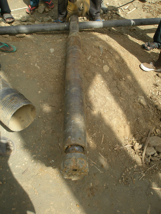 Eigentlich. Beim Herausholen des Bohrkopfes verkeilte er sich in einer Tiefe von 22 Metern. Nichts ging mehr. Die Enttäuschung war groß; beim Bohrteam, im Dorf und bei uns. Was tun? Den Bohrkopf, der immerhin einen Wert von 1.500 Euro hat, aufgeben und an einer anderen Stelle bohren?