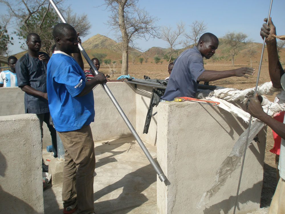 Man braucht viele Hände, um die Handpumpe zu installieren.
